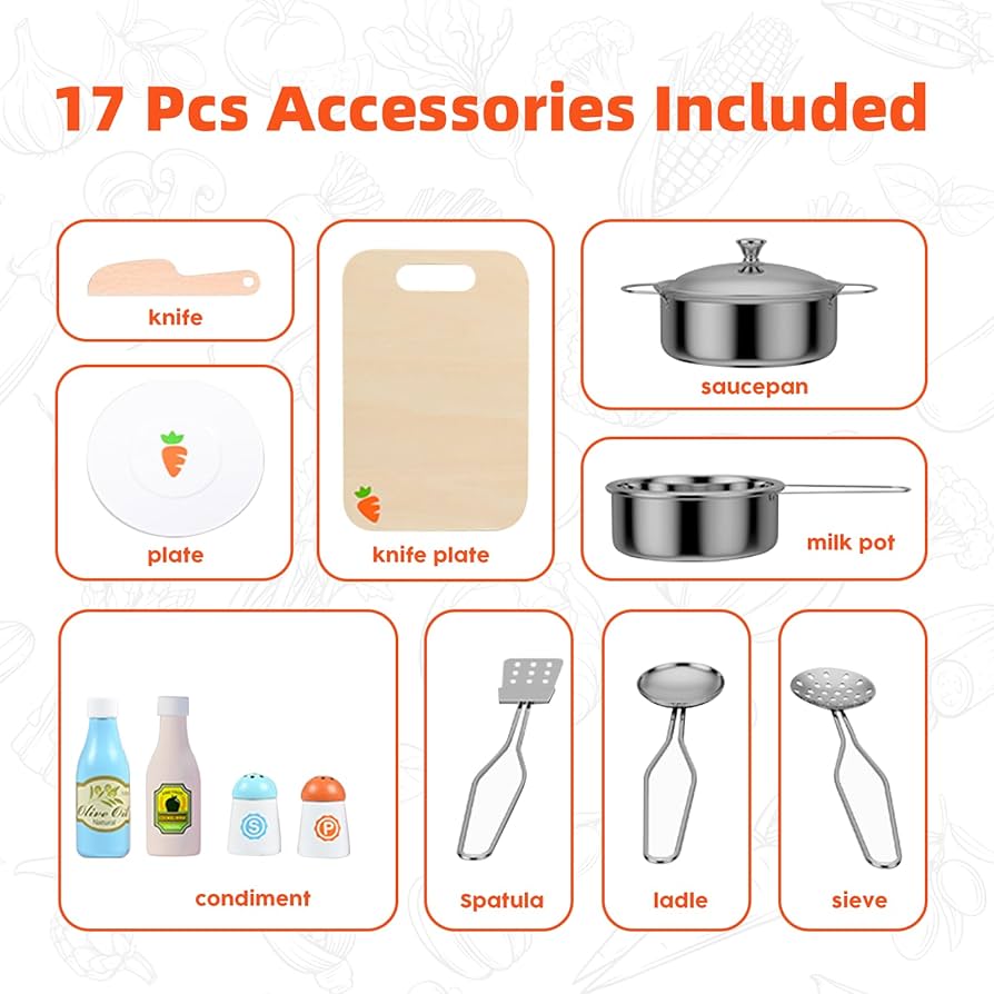- Realistic Design: It features a realistic design simulating a kitchen with a stove, microwave, oven, sink, and accessories like a pan, pot, and utensils.