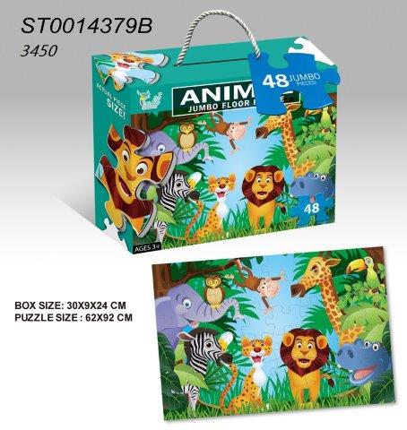 Jungle animals jumbo floor puzzle with bright illustrations. 62×92 cm assembled size.