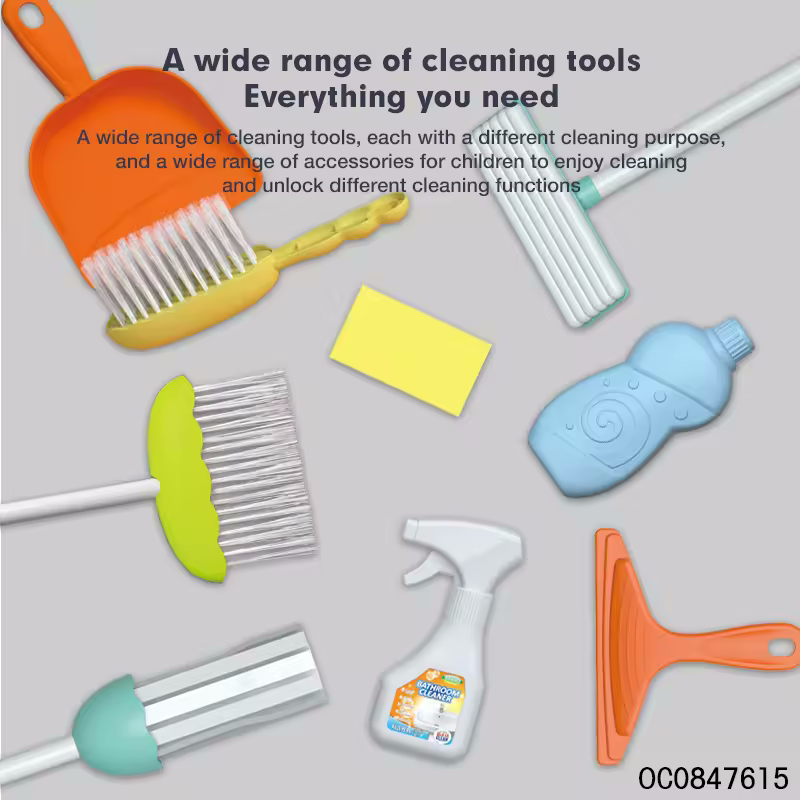Complete cleaning tools trolley with brushes, mop, spray bottle, and wheels for easy pretend play.