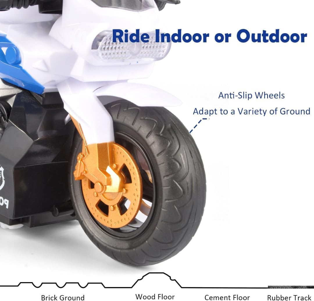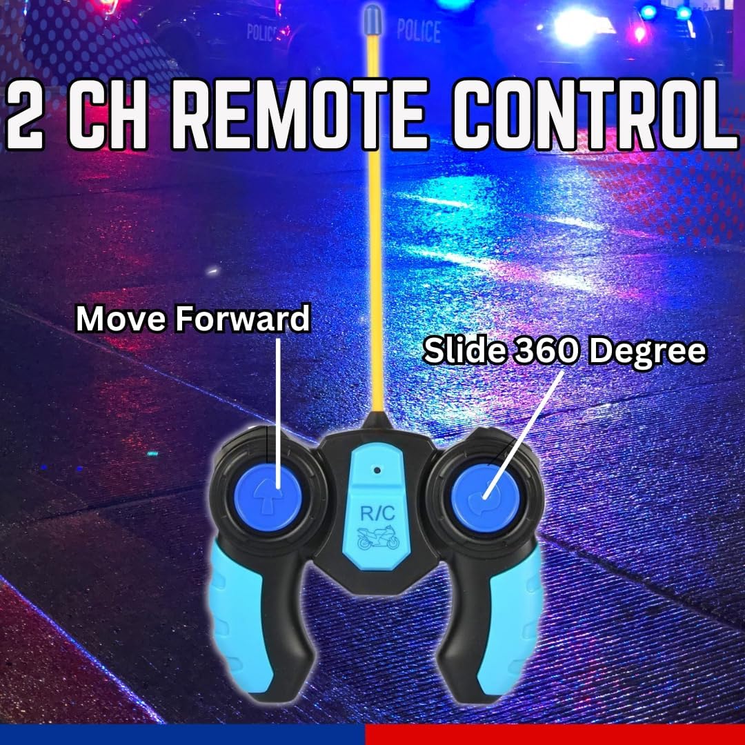 Remote control police motorcycle with realistic rider, lighting, 360° spin action and smooth driving control. Perfect for stunt-loving kids!