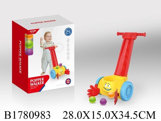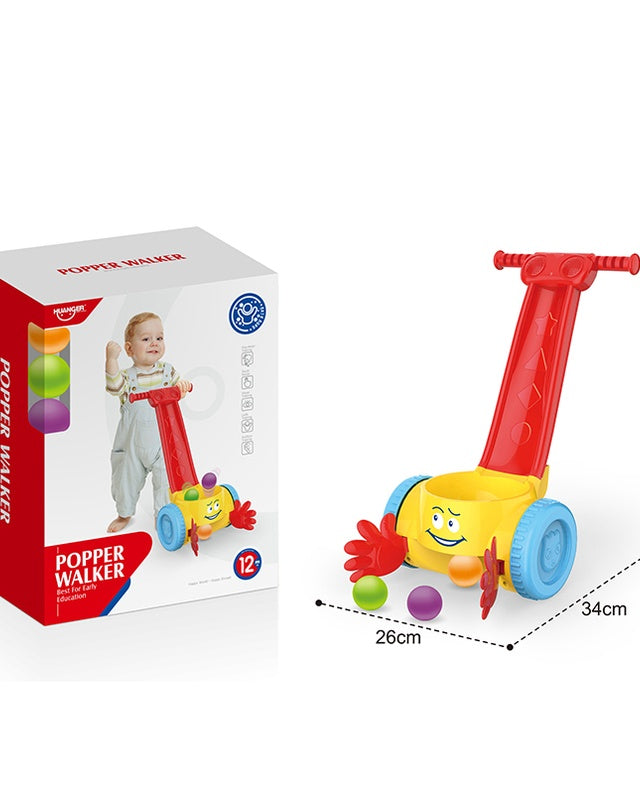 Fun push popper walker with rolling popping balls and easy-grip handle, perfect for early walking practice.