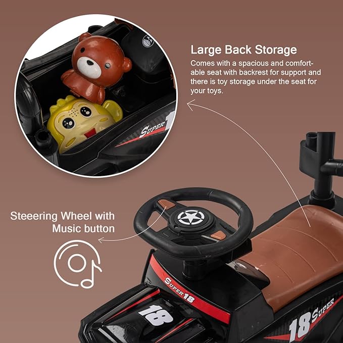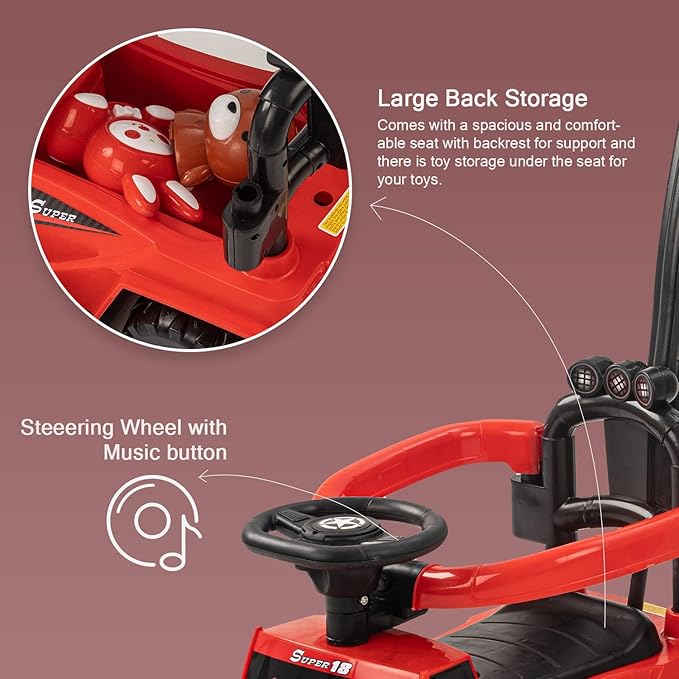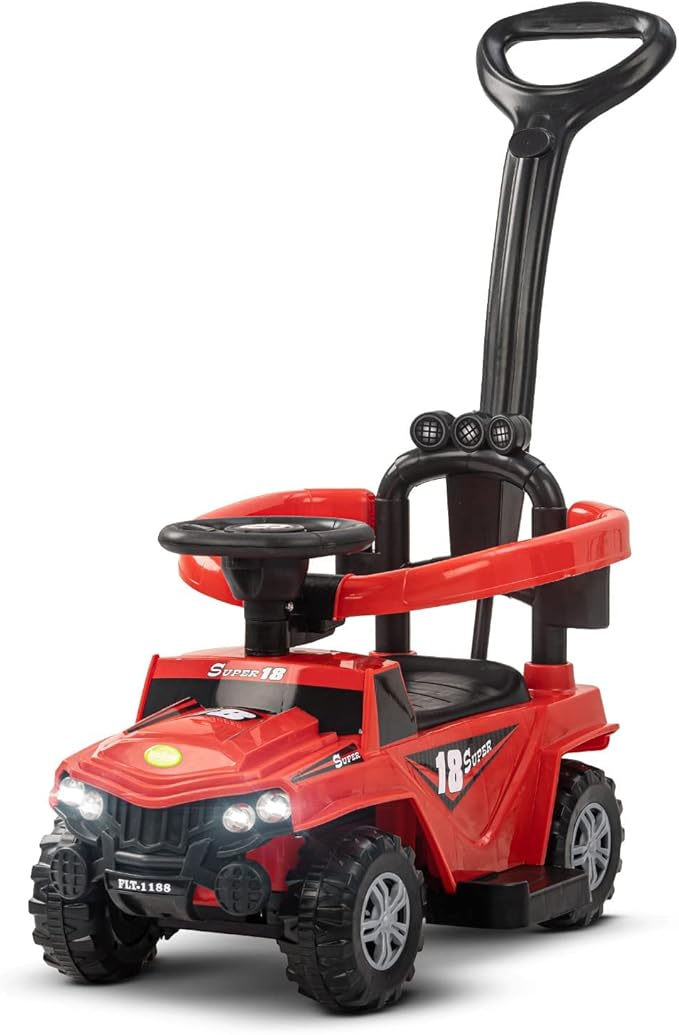 - 🚗Safe and Durable Design: Our push Ride-on Car is constructed by entirely premium virgin PVC plastic material which features non-toxic and odourless. It is secure for your baby to ride on freely. The anti-skid wide tires reduce noise and feature lightweight and shock-absorbing. The four-wheel structure can effectively prevent rollover.
