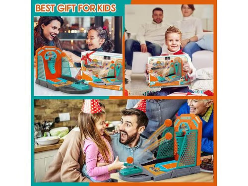 Tabletop basketball shooting game with score zones and mini balls. Develops aim, coordination, and fun competition.