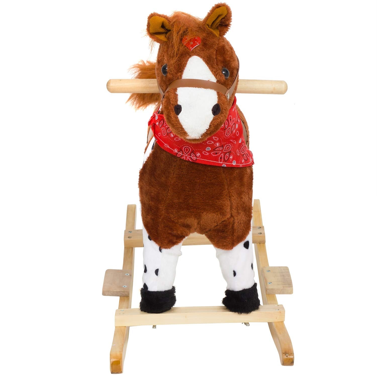 Wooden rocking horse with saddle and bandana, perfect for toddlers.